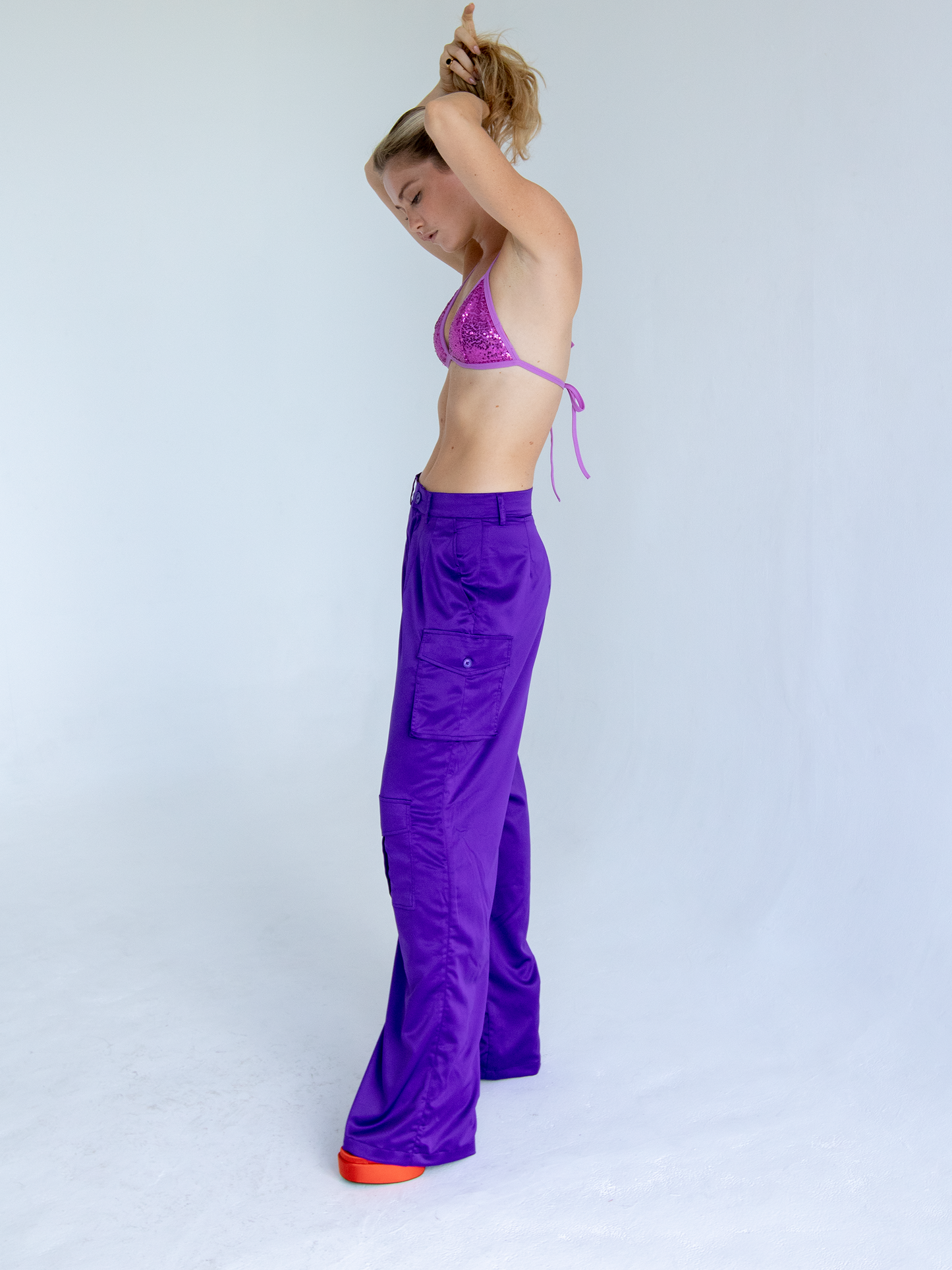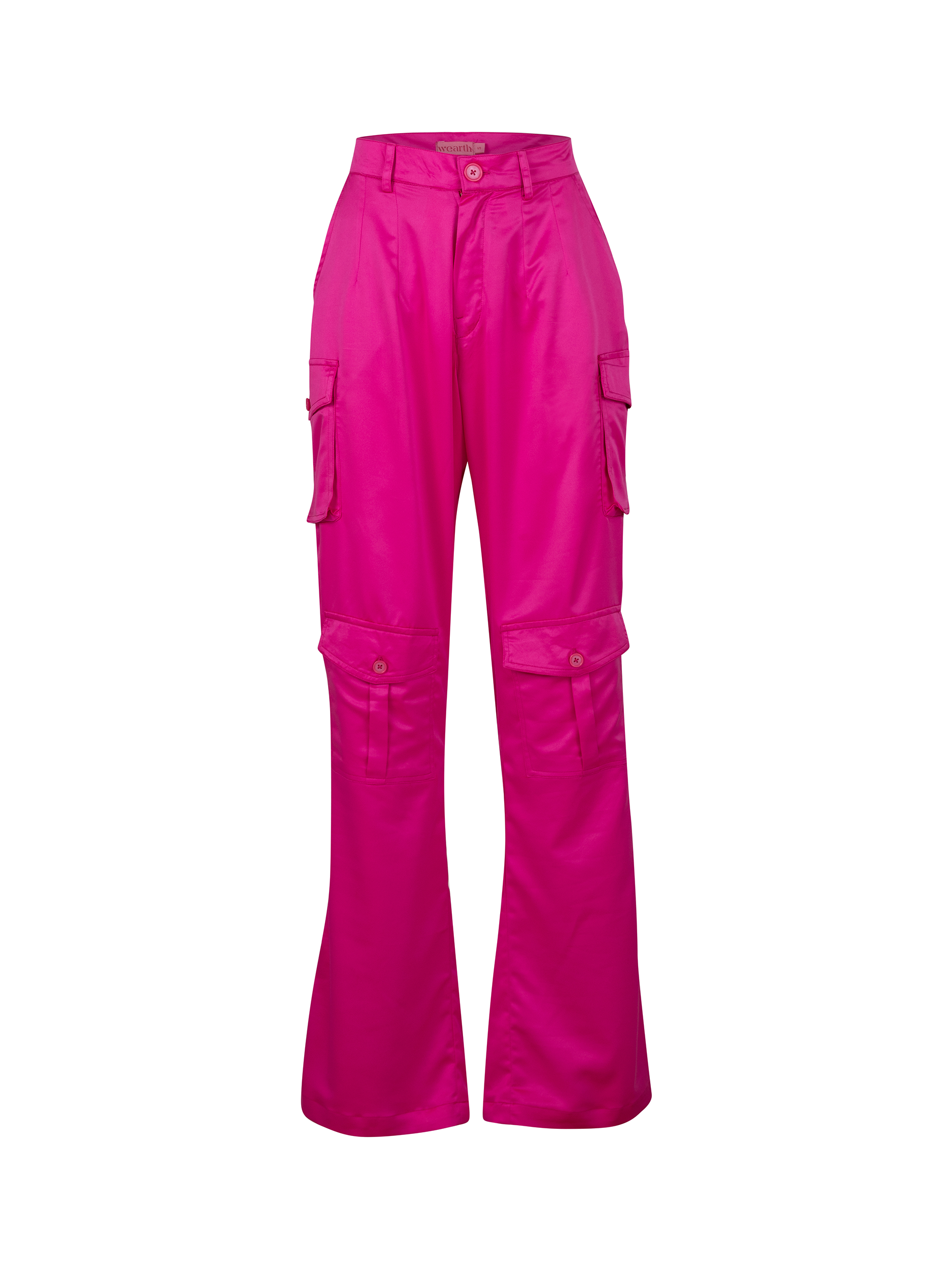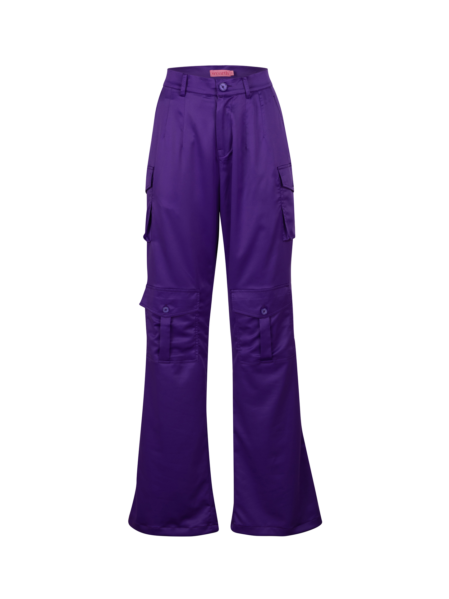 High waist silk cargo trousers, with a loose fit flared styled cargo pants with a fitted waistband.